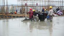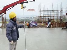 3、激光扫平仪控制砼浇注:在砼浇注之前将标高设定在柱筋上,并将准确的标高引到激光扫平仪控制系统,砼浇注人员刮平时将标高控制在比设计标高高出5—10mm范围内,为下道激光整平机整平打好础。