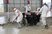 4、激光整平机整平:在专业技术人员的标高设定准确的情况下,有机械操作人员对通过激光扫平仪控制下的砼表面进行精准整平,整平机会自动以10次/秒的频率对整平机进行校准控制,以保证整平面的精准度。